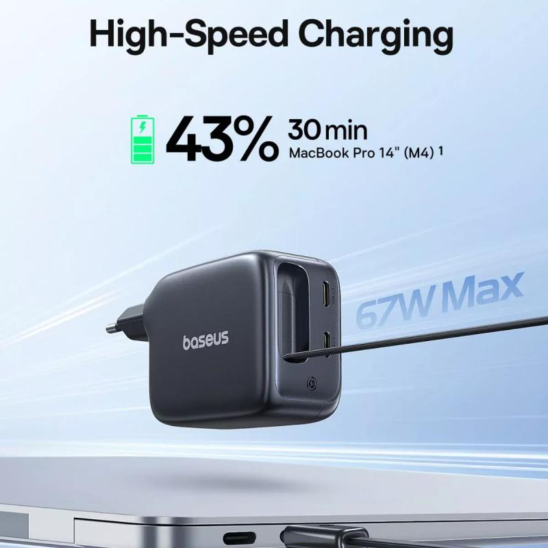 Ta ładowarka jest idealna, jeśli chcesz mieć możliwość ładowania wielu urządzeń bez konieczności noszenia ze sobą wielu adapterów i kabli. Moc wyjściowa 67W nadaje się do szybkiego ładowania laptopów, a dodatkowe porty USB-C obsługują jednocześnie telefony i akcesoria. Zintegrowany zwijany kabel pozwala utrzymać porządek i ogranicza plątaninę kabli, dzięki czemu idealnie nadaje się do podróży i codziennej pracy.