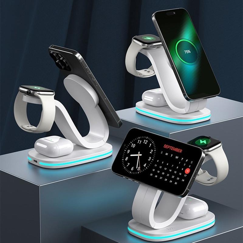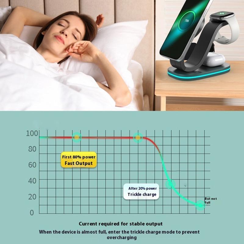 Zmniejsz bałagan na biurku dzięki jednej podstawce, która zapewnia szybkie ładowanie bezprzewodowe 15 W, doładowuje smartwatch z mocą 2 W, zasila słuchawki douszne z mocą 3 W i może służyć jako delikatna lampka nocna.