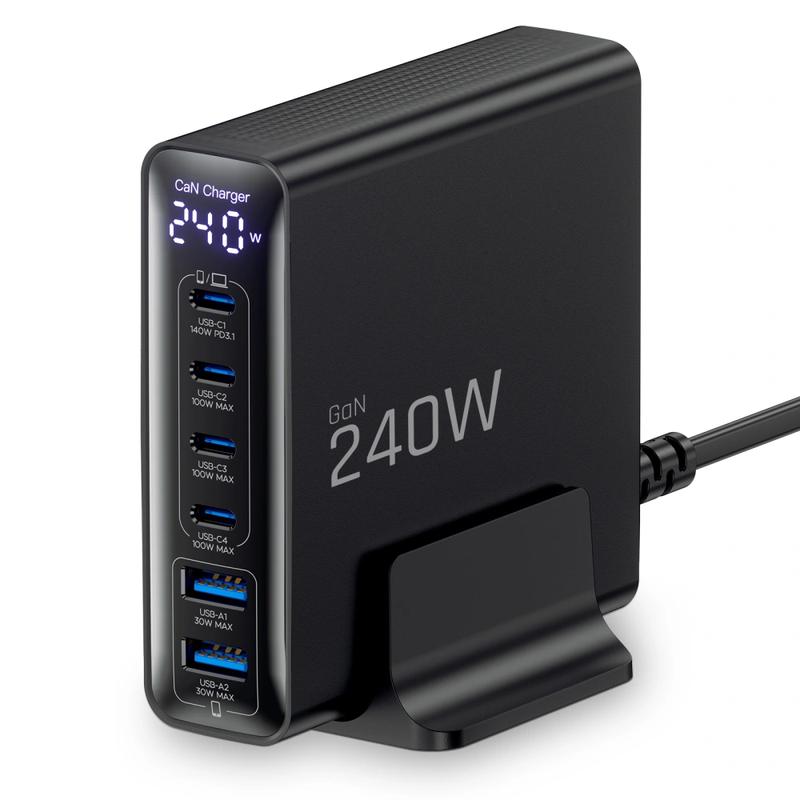 Port USB-C1 zapewnia moc do 140 W, a pozostałe porty USB-C obsługują do 100 W każdy, co pozwala na szybkie ładowanie nawet wydajnych laptopów. Obsługuje również standardy PD 3.1, QC 3.0 oraz Samsung Super Fast Charging 2.0. Wbudowany wyświetlacz LED pokazuje aktualny poziom naładowania, a stabilna podstawa w kształcie litery U utrzymuje ładowarkę w pozycji pionowej na biurku.
