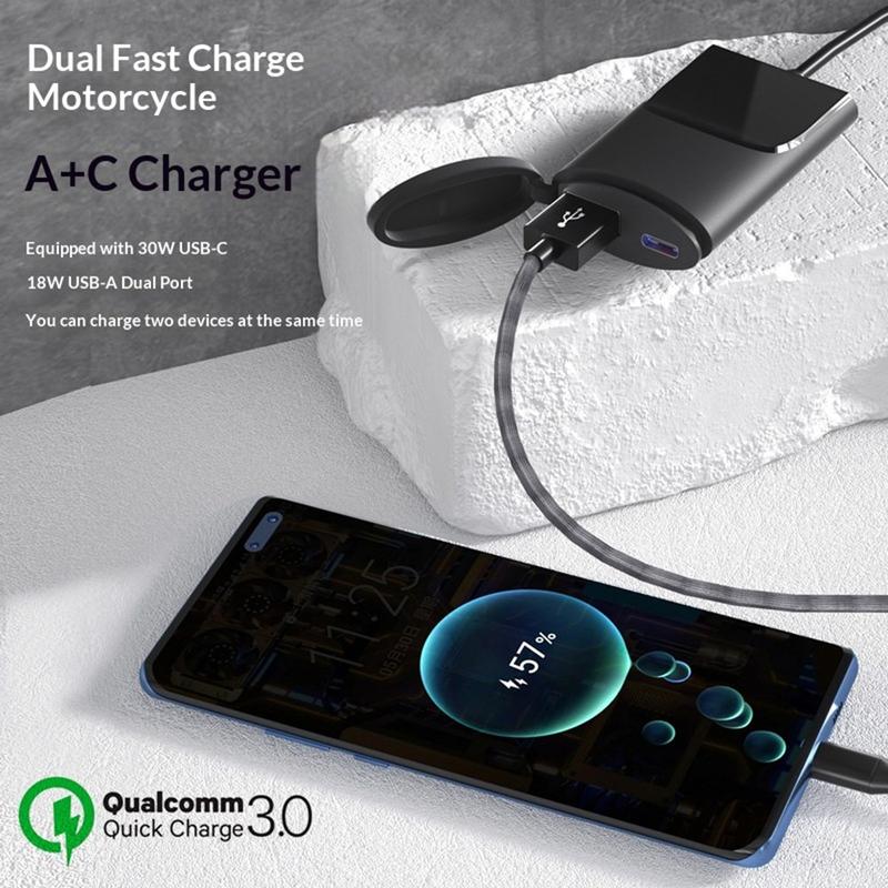 Dzięki portowi USB-C PD o mocy 30W i portowi USB-A o mocy 18W ładowarka ta obsługuje szybkie ładowanie szerokiej gamy urządzeń i umożliwia ładowanie dwóch urządzeń jednocześnie. Wodoodporna konstrukcja o stopniu ochrony IP67 oraz wbudowane zabezpieczenia sprawiają, że jest to niezawodny wybór do codziennej jazdy i użytkowania na zewnątrz w zmiennych warunkach pogodowych.