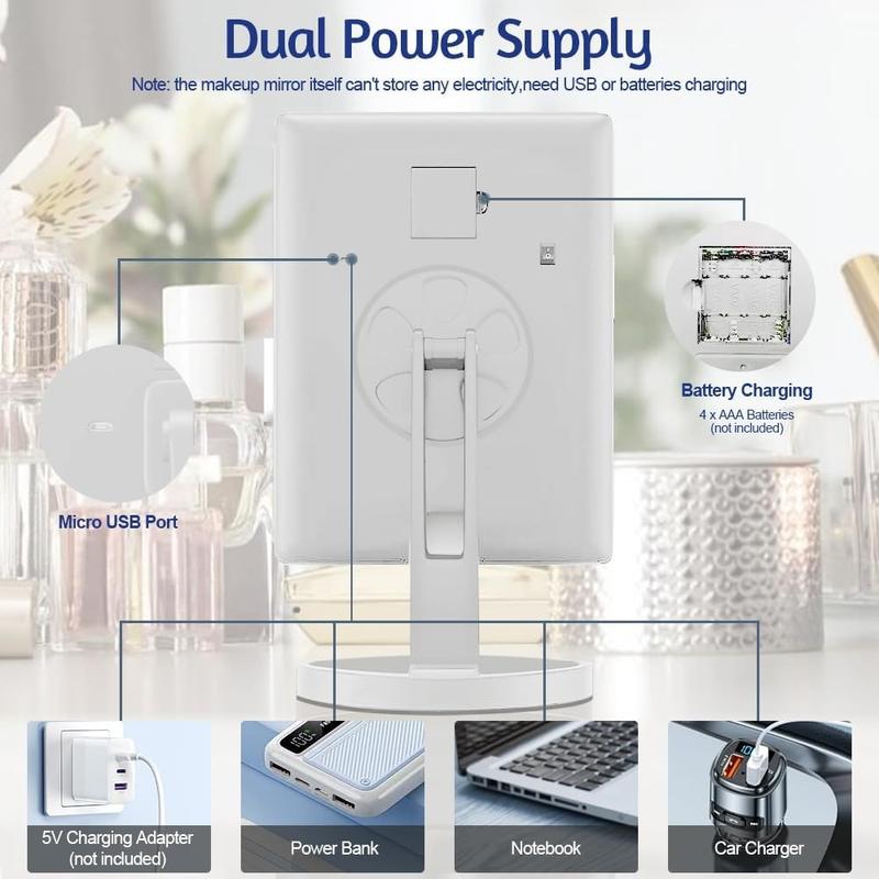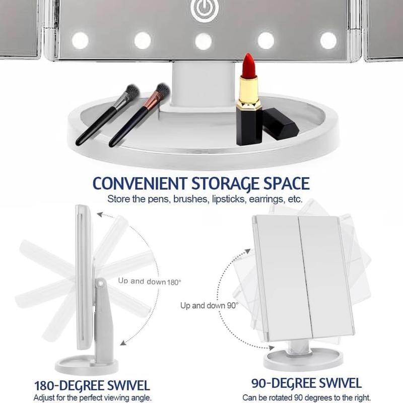 3-stronne, składane lusterko do makijażu LED, zaprojektowane z myślą o precyzji, jasności i elastyczności w celu nieskazitelnego nakładania makijażu. Dzięki regulowanemu oświetleniu i wielu opcjom powiększenia, to stylowe lusterko stołowe pomaga osiągnąć salonową jakość w domu.