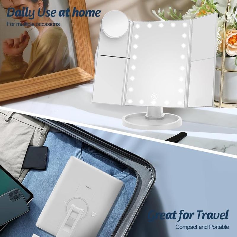 3-stronne składane lusterko do makijażu z 22 diodami LED - lusterko powiększające 1X/2X/3X/10X