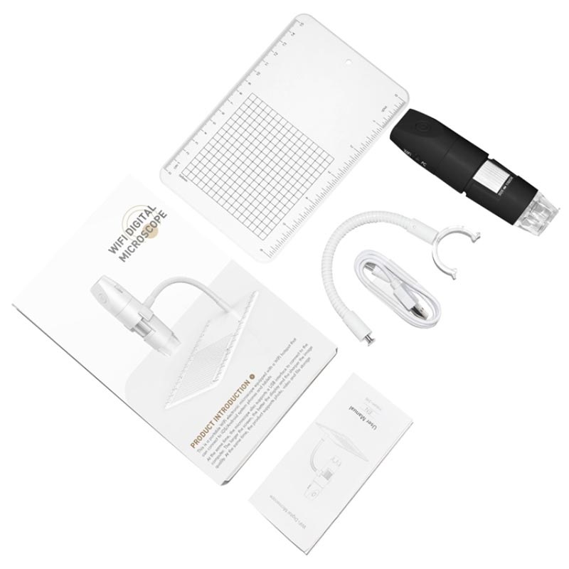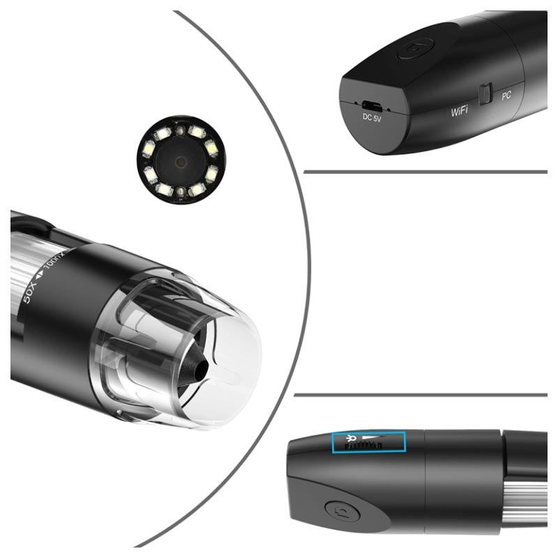 8 regulowanych diod LED zapewnia optymalną wyrazistość, a aparat 2MP umożliwia dokładną obserwację próbek 3D, takich jak owady, monety, biżuteria w najdrobniejszych szczegółach dzięki powiększeniu 50x do 1000x. Podłącz cyfrowy mikroskop za pomocą WiFi ze swoim urządzeniem z Androidem lub iOS albo z komputerem z Windows lub Mac. Gdy łączność WiFi jest niedostępna, użyj kabla microUSB do podłączenia urządzenia ze sprzętem z USB.