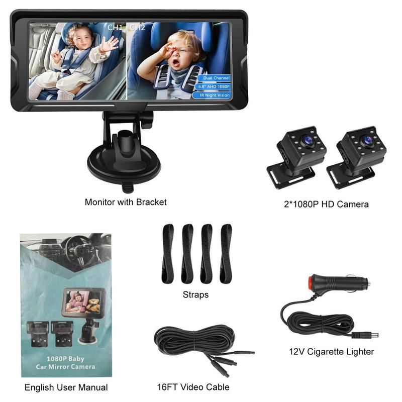 Zapewnij sobie spokój ducha i bezpieczniejszą jazdę dzięki 6,8-calowej samochodowej elektronicznej niani dla dziecka z dwiema kamerami. Zaprojektowany z dwiema kamerami 1080P HD i szerokim 6,8-calowym wyświetlaczem, system ten umożliwia jednoczesne monitorowanie dwojga dzieci lub różnych obszarów tylnego siedzenia. Wyposażony w obrotowe kamery 360°, ulepszony noktowizor na podczerwień i szerokie pole widzenia 150°, zapewnia niezawodny zasięg w dzień i w nocy. Łatwa w instalacji i zbudowana z wytrzymałej wodoodpornej obudowy, ta niania jest idealnym towarzyszem bezpieczeństwa w samochodzie dla rodzin.