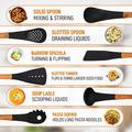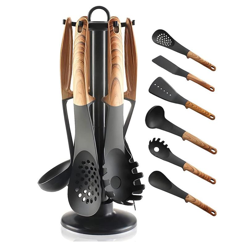 - Kompletna 7-elementowa kolekcja do gotowania - zawiera wszystkie niezbędne akcesoria kuchenne: chochlę do zupy, łyżkę cedzakową, łyżkę pełną, szpatułkę cedzakową, szpatułkę pełną, łyżkę do makaronu i pasujący stojak do przechowywania.
