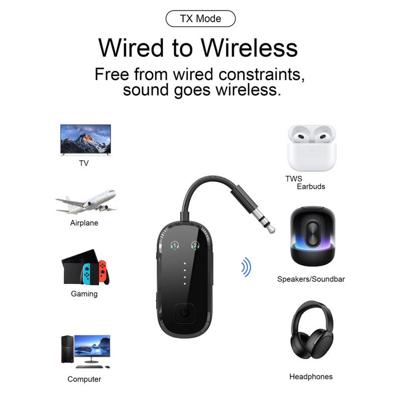 - Użyj trybu TX, aby podłączyć telewizor, komputer lub inne przewodowe źródło dźwięku do słuchawek Bluetooth w celu bezprzewodowego słuchania