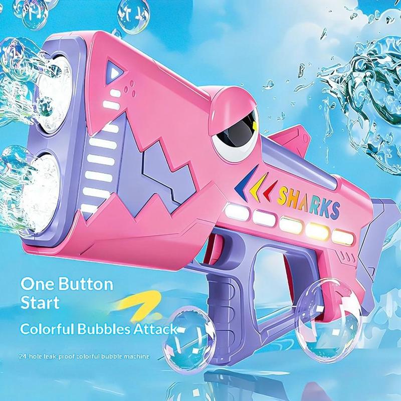 Automatyczny pistolet na bańki mydlane w kształcie rekina - automatyczna maszyna do baniek z 24 otworami i podświetleniem LED, ładowana przez USB