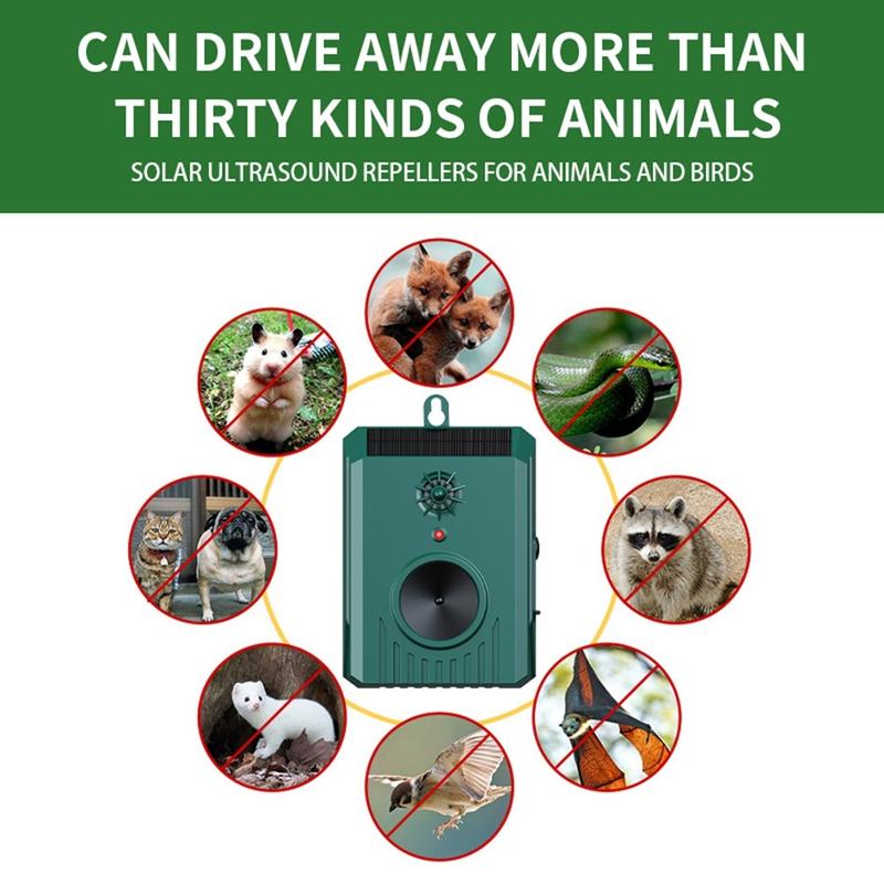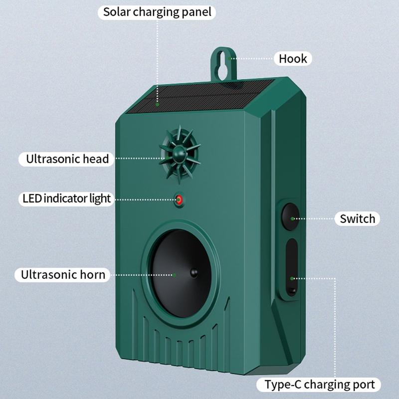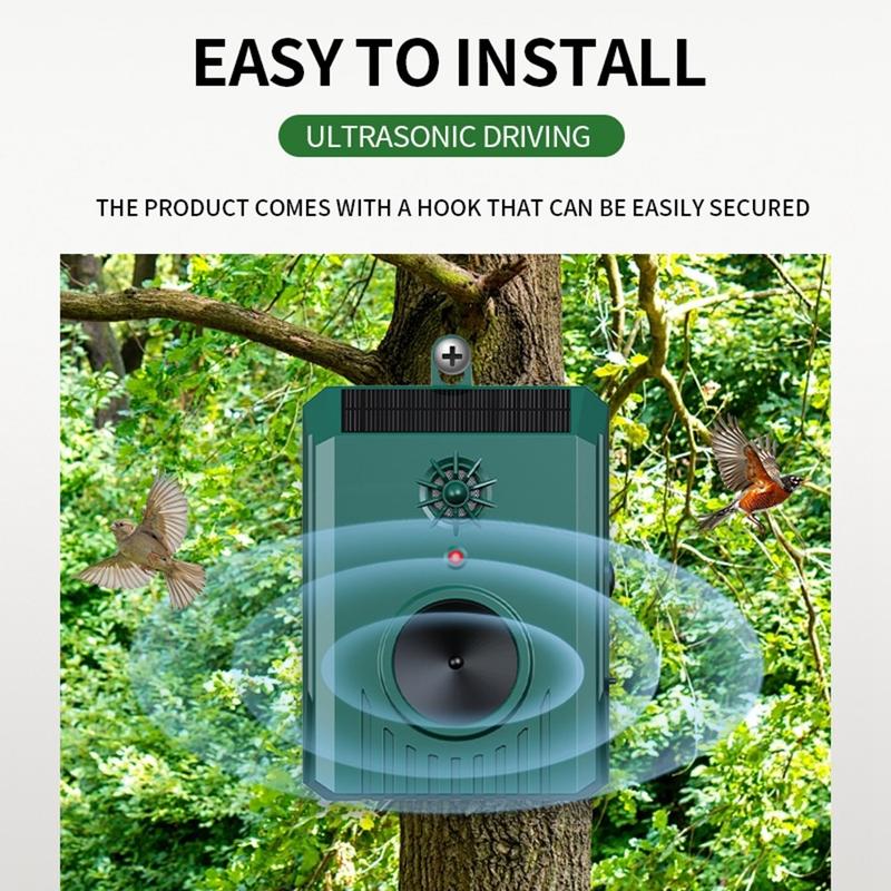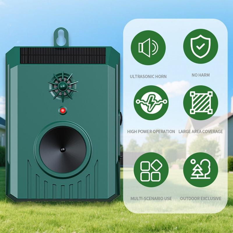 Łącząc fale ultradźwiękowe (8-35 kHz) z dźwiękiem, urządzenie skutecznie odstrasza ptaki, gryzonie, nietoperze, psy, wiewiórki i inne dzikie zwierzęta. Konstrukcja o podwójnym działaniu zwiększa skuteczność odstraszania szerszego zakresu szkodników.