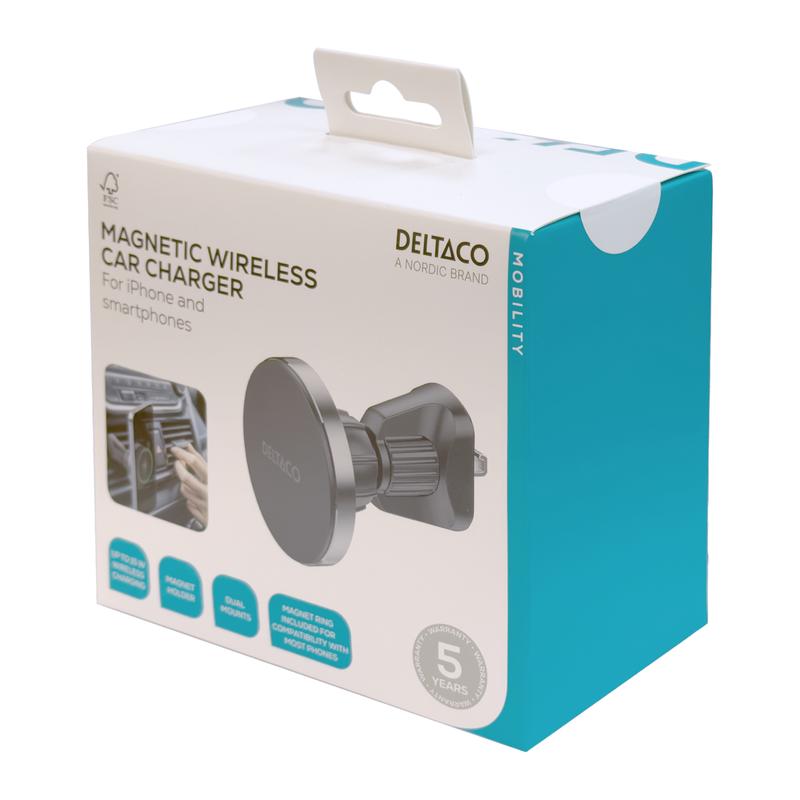 Bezprzewodowa ładowarka samochodowa Deltaco z odłączanym uchwytem magnetycznym - uchwyt Qi2 o mocy 15W z mocowaniem do otworu wentylacyjnego i przyssawką