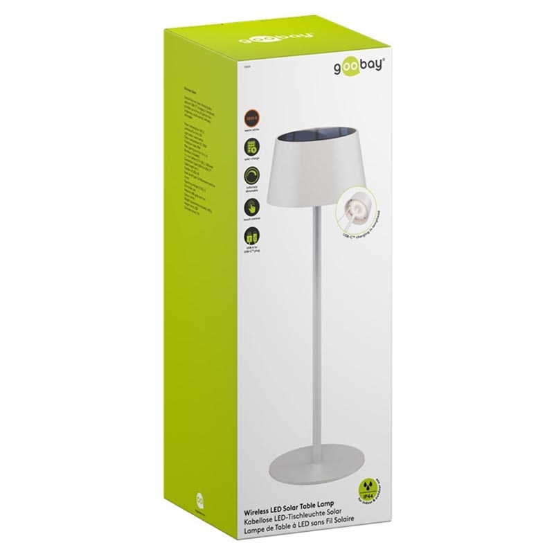 Bezprzewodowa lampa stołowa LED Goobay - ciepła biel 3000 K, 150 lm, sterowanie dotykowe, płynna regulacja jasności, ładowanie słoneczne + USB-C, IP44