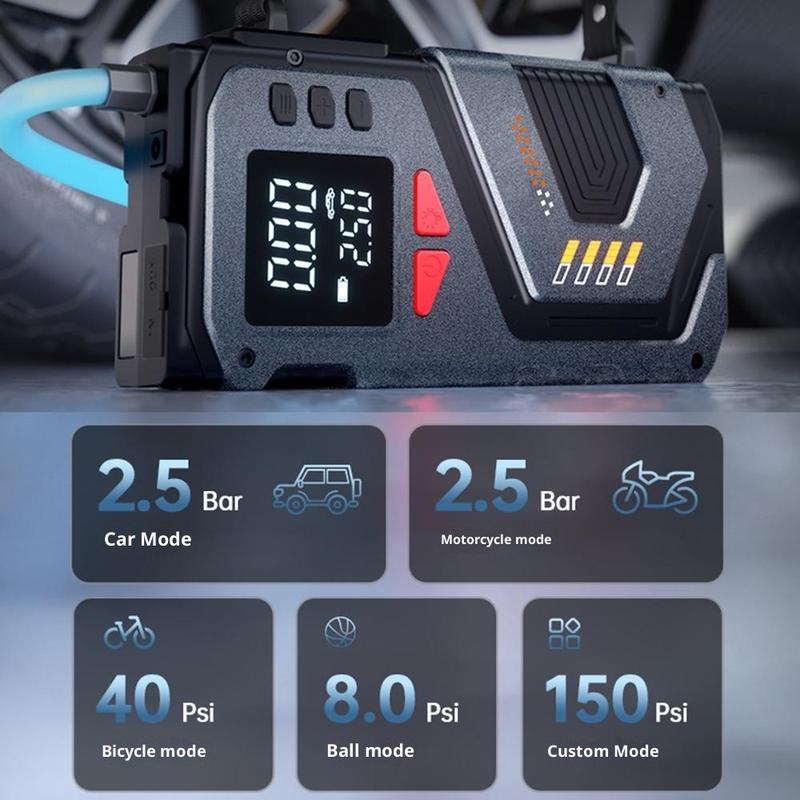 Wyposażona w silnik o mocy 60-120 W, pompka szybko napompuje opony samochodowe i rowerowe, sprzęt sportowy i inne nadmuchiwane przedmioty. Cyfrowy wyświetlacz ciśnienia w oponach zapewnia dokładne odczyty PSI, pomagając w bezpiecznym i prawidłowym pompowaniu za każdym razem.