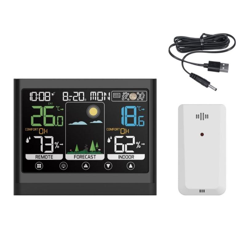 Ten zegar pogodowy to świetny wybór dla każdego, kto szuka przejrzystego i wygodnego sposobu na monitorowanie czasu, komfortu w pomieszczeniach i warunków pogodowych na zewnątrz w jednym urządzeniu. Łączy w sobie duży kolorowy ekran dotykowy, prognozę pogody, obsługę bezprzewodowych czujników i praktyczne funkcje alarmowe w kompaktowej obudowie. To sprawia, że jest to przydatny wybór do domów, biur, sypialni, kuchni i dla każdego, kto lubi mieć codzienne informacje w zasięgu wzroku.