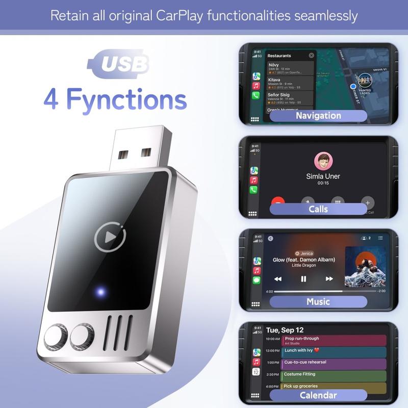 Adapter w pełni obsługuje wszystkie oryginalne funkcje CarPlay, w tym nawigację, połączenia telefoniczne, strumieniowe przesyłanie muzyki, wiadomości i dostęp do kalendarza. Twoje wrażenia z jazdy pozostają znajome, tylko bez kabla.