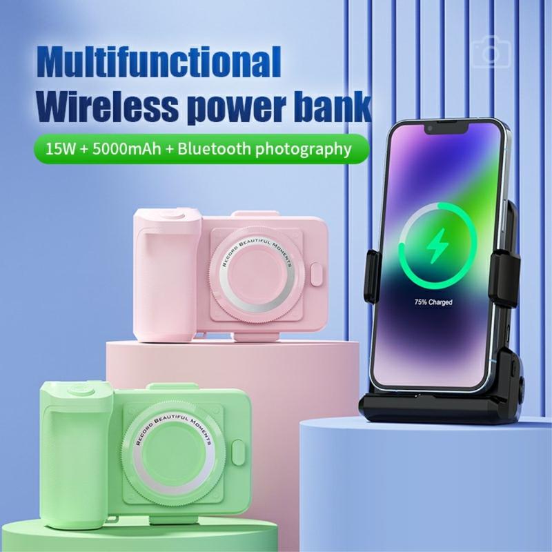 Bezprzewodowy Power Bank YR-1 3 w 1 to wszechstronne urządzenie łączące bezprzewodowe ładowanie, uchwyt na telefon i migawkę aparatu Bluetooth. Posiada baterię o pojemności 5000 mAh, szybkie ładowanie bezprzewodowe o mocy 15 W i mechaniczny klips do telefonu komórkowego zapewniający stabilne fotografowanie. Kompatybilny z różnymi urządzeniami, zawiera adaptery magnetyczne Type-C i Micro USB dla telefonów bez funkcji ładowania bezprzewodowego.
