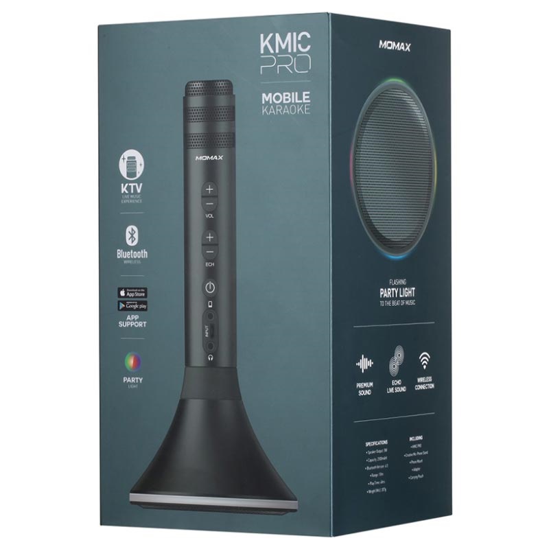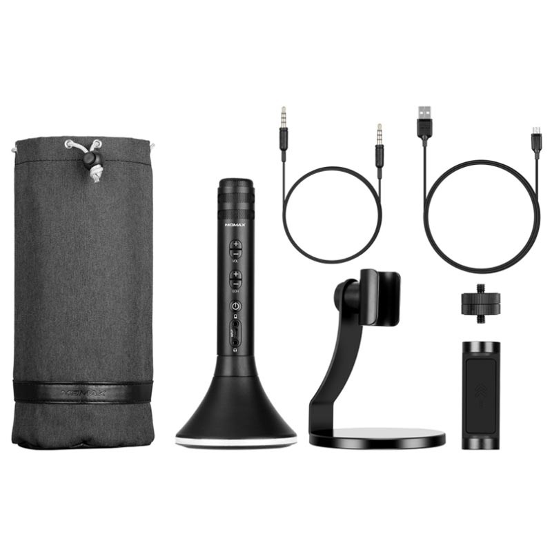 Zorganizuj najlepszą imprezę wszechczasów i pozwól każdemu być gwiazdą karaoke z tym fantastycznym, bezprzewodowym mikrofonem marki Momax. Momax Kmic Pro z wysokogatunkowego stopu aluminium, osłoniętego profesjonalną metalową siateczką, która tłumi szumy i zapewnia doskonały dźwięk z potężnym efektem KTV. Przyciski na mikrofonie pozwalają regulować głośność i świetną funkcję echo. Łatwo łączy się przez Bluetooth ze smartfonem i jest gotowy do użycia. Ponadto, Kmic Pro można podłączyć do urządzenia kablem 3.5 mm, by nagrywać i odsłuchiwać muzykę dzięki wbudowanemu głośnikowi Bluetooth. Zestaw zawiera kreatywny statyw na Kmic Pro i wygodny uchwyt do telefonu, który zapewnia różnorodne kąty patrzenia na tekst podczas śpiewania. Dodatkową funkcją są wbudowane kolorowe światła LED, pulsujące w rytm muzyki, podkręcając Twoją imprezę.