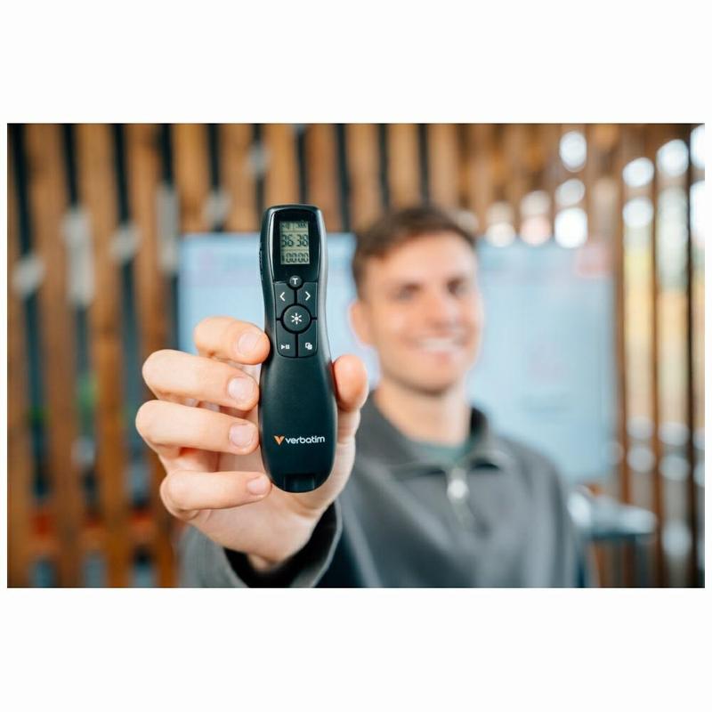 Dzięki bezprzewodowemu pilotowi Verbatim Keynote z wyświetlaczem LCD każda prezentacja przebiega płynnie, profesjonalnie i zgodnie z harmonogramem. Wyraźny ekran LCD pokazuje licznik czasu i stan baterii, dzięki czemu można kontrolować tempo prezentacji bez konieczności sprawdzania telefonu lub zegarka. Intuicyjne sterowanie slajdami i wbudowany alarm pozwalają skupić się na odbiorcach, a pilot pomaga dotrzymać harmonogramu.
