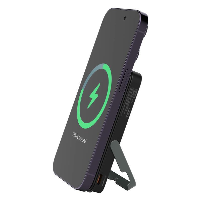Dzięki bezprzewodowemu ładowaniu o mocy do 15 W dla kompatybilnych urządzeń i do 7,5 W dla iPhone'ów, ładowanie bez kabli jest łatwe. Wbudowany magnes jest kompatybilny z rozwiązaniem magnetycznym Apple i podobnymi systemami, co pomaga utrzymać power bank w odpowiednim położeniu podczas użytkowania. Zintegrowana podstawka zapewnia dodatkową elastyczność, ułatwiając oglądanie filmów, przeglądanie stron internetowych lub prowadzenie rozmów podczas ładowania telefonu.
