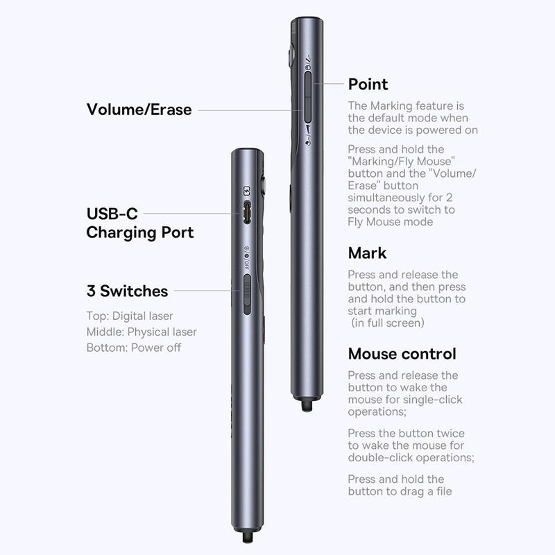 Osiągnij płynne i dopracowane prezentacje dzięki bezprzewodowemu prezenterowi BASEUS Orange Dot AI Voice. Dzięki łączności w dwóch trybach (2.4G i Bluetooth 5.1), trzem różnym opcjom lasera i zestawowi wygodnych funkcji, ten prezenter jest przeznaczony zarówno dla profesjonalistów, jak i nauczycieli. Dzięki dużemu zasięgowi sterowania i długiemu czasowi pracy baterii możesz przyciągnąć uwagę z każdego zakątka pomieszczenia.