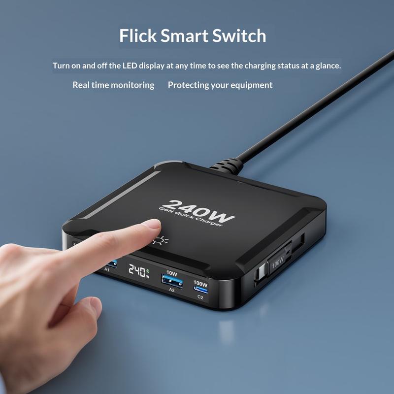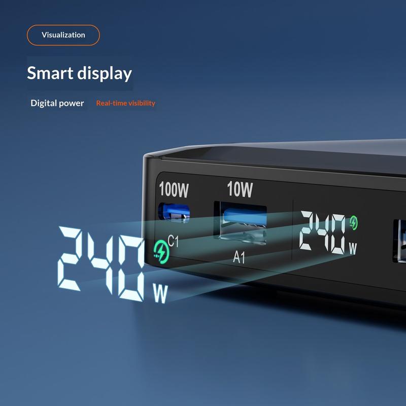 Inteligentny cyfrowy wyświetlacz LED pokazuje informacje o zasilaniu w czasie rzeczywistym, w tym całkowitą moc i aktywność portów, dzięki czemu można łatwiej monitorować stan ładowania. Dotykowy przełącznik wyświetlacza sprawia również, że wygodniej jest wyłączyć ekran, gdy w nocy chcesz mieć ciemniejsze pomieszczenie. Wbudowane inteligentne zabezpieczenia pomagają zapewnić bezpieczniejsze ładowanie poprzez automatyczną regulację mocy wyjściowej oraz ochronę przed przegrzaniem, przetężeniem, przepięciem i zwarciami.