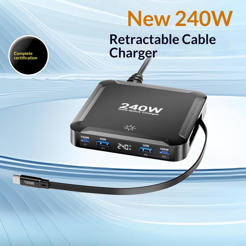Stacja ładująca BK-124D to praktyczne, wysokowydajne centrum ładowania, zaprojektowane z myślą o nowoczesnych biurkach, szafkach nocnych i miejscach pracy, które pozwala na bardziej wydajne ładowanie wielu urządzeń jednocześnie. Dzięki łącznej mocy wyjściowej do 240W ta kompaktowa ładowarka 5 w 1 łączy w sobie 2 porty USB-C, 2 porty USB-A oraz wbudowany, wysuwany kabel USB-C, co czyni ją doskonałym rozwiązaniem do ładowania telefonów, tabletów, laptopów, słuchawek dousznych, powerbanków i innych urządzeń codziennego użytku z jednej centralnej stacji.