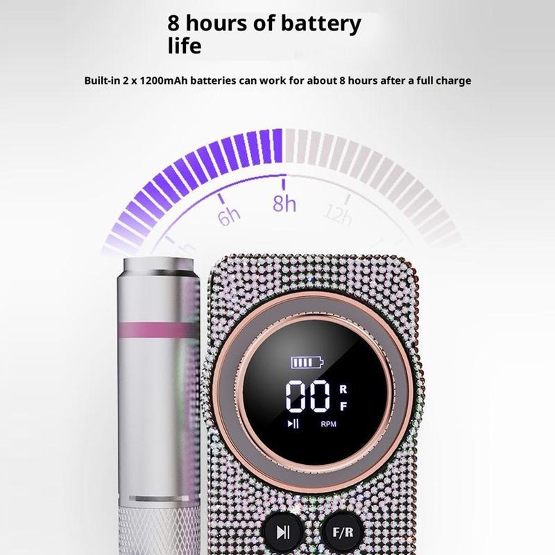Dzięki silnikowi o dużej prędkości, osiągającemu nawet 35 000 obrotów na minutę, zapewnia płynną i stabilną pracę podczas modelowania, piłowania, wygładzania i ogólnej pielęgnacji paznokci. Wyświetlacz LCD ułatwia monitorowanie prędkości, poziomu naładowania baterii, kierunku obrotów i statusu pauzy, a uchwyt z szybkim blokowaniem pozwala na łatwą wymianę wierteł bez użycia dodatkowych narzędzi. Akumulator zapewnia do 8 godzin pracy, co sprawia, że urządzenie jest praktyczne podczas dłuższych sesji w domu, w salonach lub w podróży.