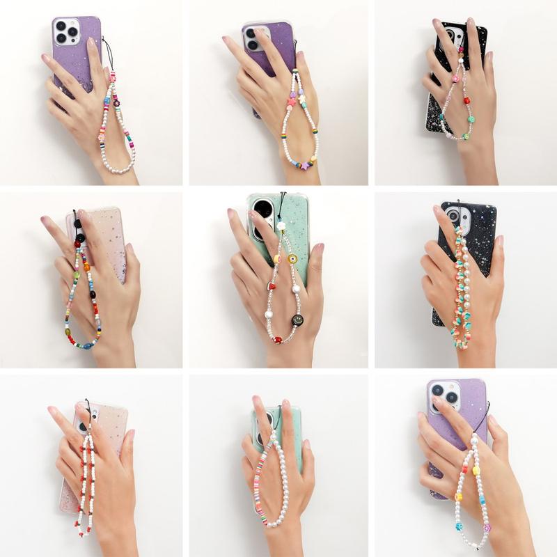 Smycz do telefonu z kolorowymi koralikami w kolorze perłowym, 22cm - akrylowa zawieszka na nadgarstek, łańcuszek do telefonu