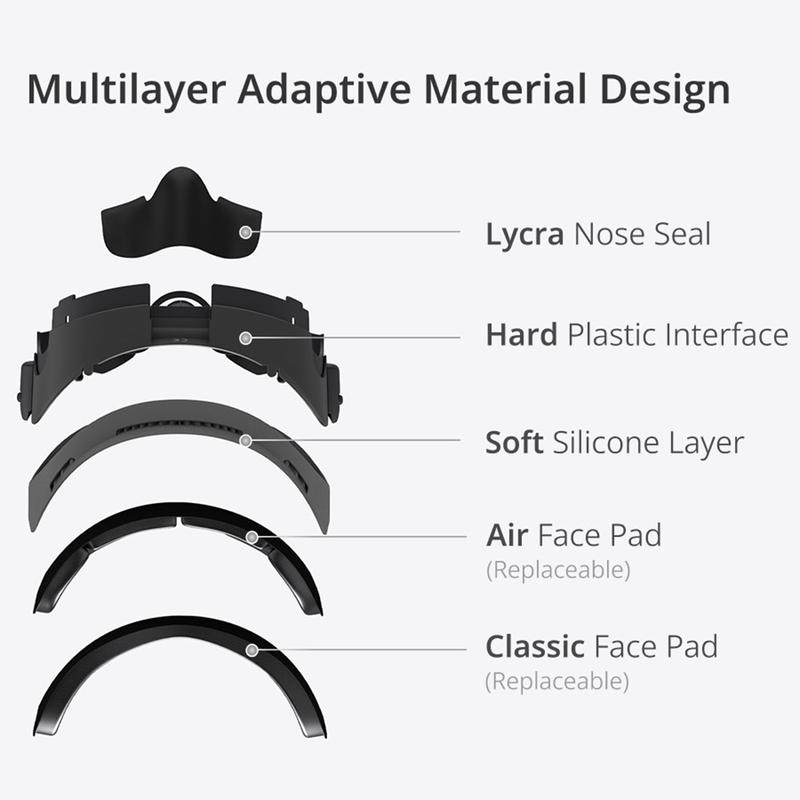 Wykonana z oddychającego materiału lycra i blokującej światło uszczelki na nos, maska redukuje niepożądane wycieki światła, pozwalając ci zanurzyć się głębiej w światach VR. Lekka konstrukcja pozwala skupić się na doświadczeniu, a nie na sprzęcie.