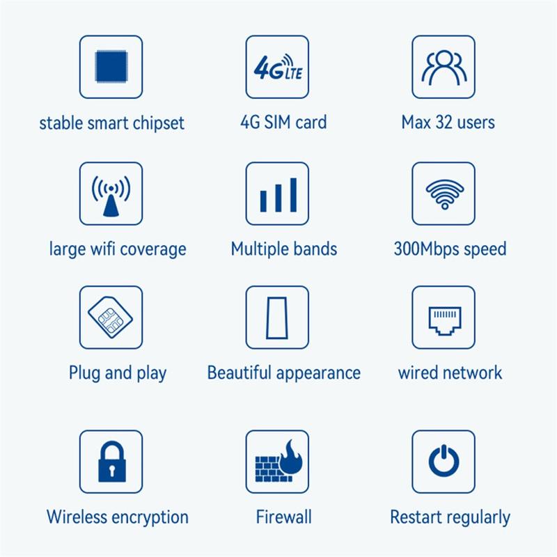 Przekształć swój sygnał 4G w hotspot Wi-Fi o zasięgu 20-30 metrów. Router obsługuje do 32 urządzeń jednocześnie, co czyni go idealnym rozwiązaniem dla gospodarstw domowych, małych biur i współdzielonych przestrzeni.
