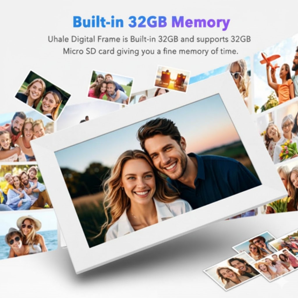 Ramka zawiera 32 GB pamięci wewnętrznej, wystarczającej na tysiące zdjęć. Potrzebujesz więcej miejsca? Włóż kartę Micro SD, aby uzyskać dodatkową pamięć i łatwe zarządzanie plikami.