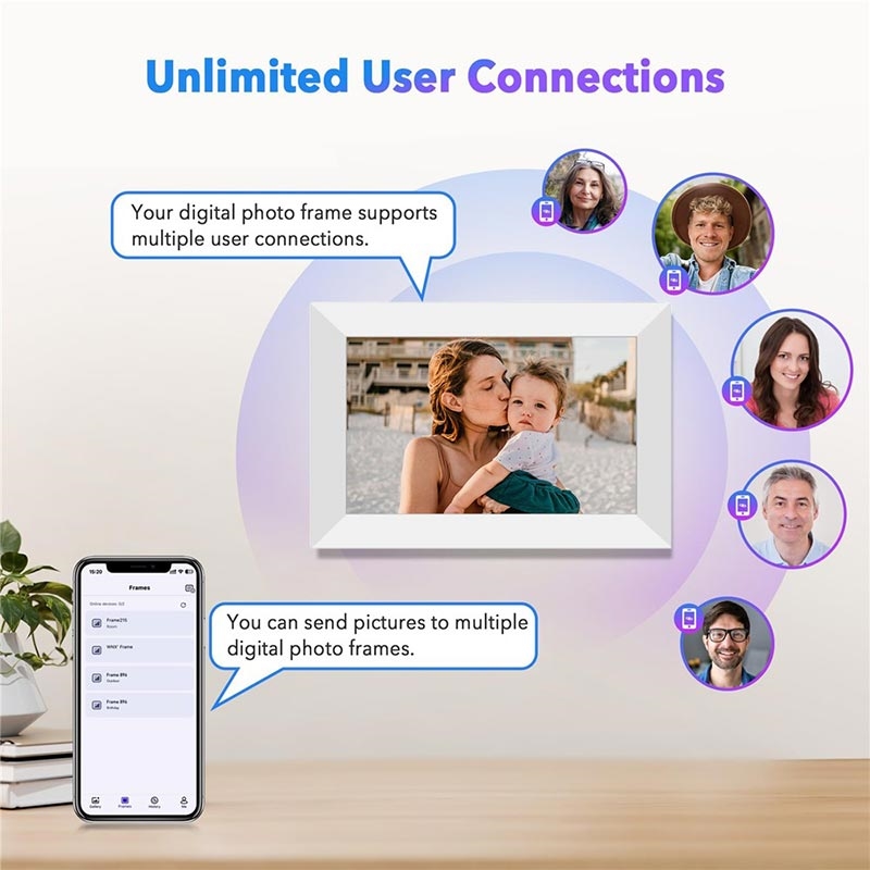 Korzystając z towarzyszącej aplikacji mobilnej, można natychmiast wysyłać zdjęcia lub filmy do ramki z dowolnego miejsca. Obsługa synchronizacji z wieloma urządzeniami pozwala kilku członkom rodziny dzielić się chwilami bezpośrednio na ramce.