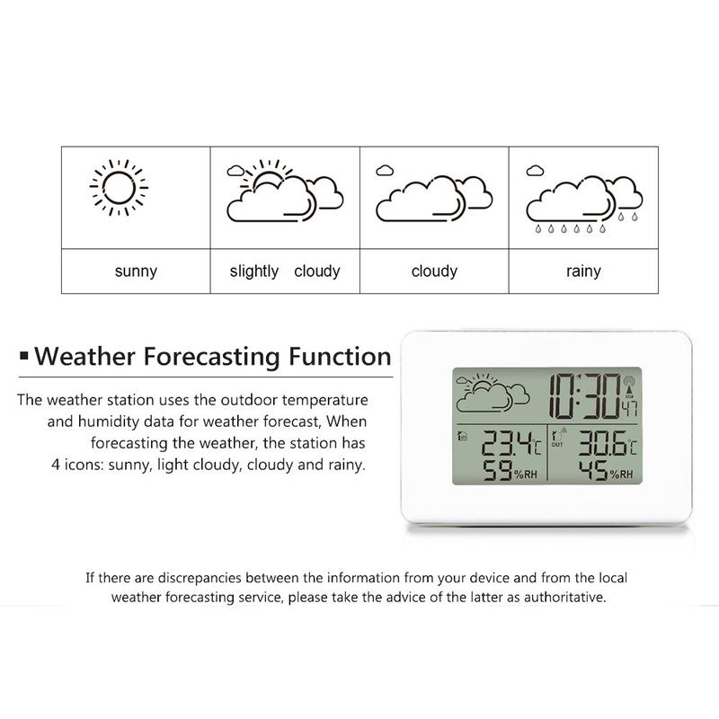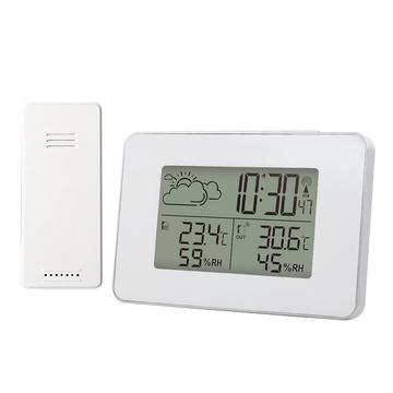 - Cyfrowa stacja pogodowa z odczytami temperatury i wilgotności wewnątrz i na zewnątrz pomieszczeń