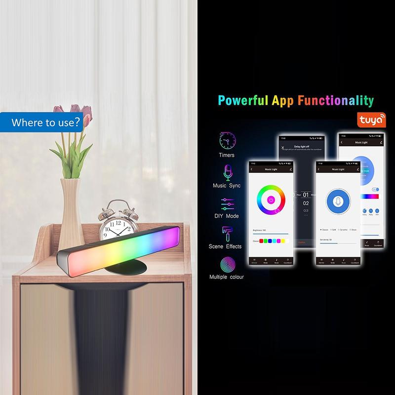 Sterowanie jest proste i elastyczne. Użyj aplikacji na smartfona, aby uzyskać bardziej zaawansowane opcje dostosowywania, lub dołączonego 24-przyciskowego pilota, aby szybko zmieniać kolor, jasność i tryby. Inteligentny timer pozwala ustawić automatyczne wyłączanie, co zapewnia dodatkową wygodę i oszczędność energii. Dzięki dwóm opcjom umieszczenia można ustawić listwy pionowo obok monitorów lub poziomo, aby dopasować je do różnych układów biurka, a zasilanie USB ułatwia konfigurację w dowolnym miejscu, w którym znajduje się port 5 V.