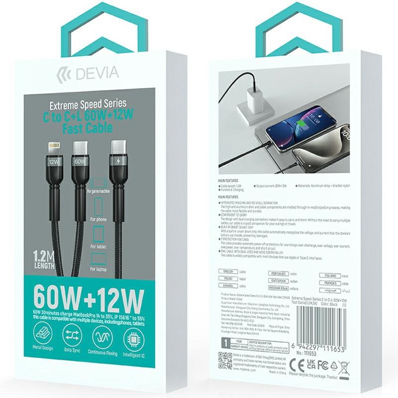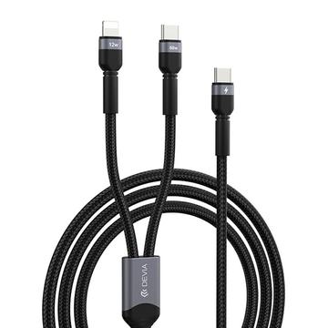 Kabel USB-C 2 w 1 Devia EC648 Extreme Speed - USB-C do USB-C 60 W PD i Lightning 12 W, pleciony nylon, synchronizacja danych, 1.2m