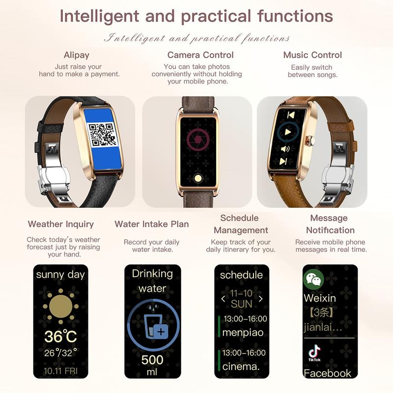 Bądź zorganizowany i połączony z szeregiem inteligentnych narzędzi: Obsługa Alipay, sterowanie muzyką, zdalna kamera, alerty wibracyjne, powiadomienia o wiadomościach, aktualizacje pogody, przypomnienia o nawodnieniu i zarządzanie harmonogramem. Zaprojektowany specjalnie dla kobiet, obejmuje również śledzenie cyklu menstruacyjnego i przyciemnianie wyświetlacza w trybie nocnym dla spokojnych wieczorów.