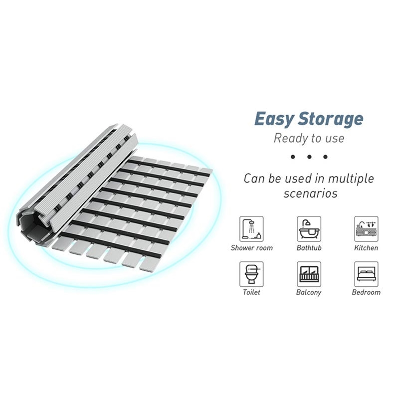 Miękka, zginana konstrukcja maty ułatwia jej zwijanie i przechowywanie, gdy nie jest używana. Idealna do kompaktowych łazienek, małych mieszkań, przyczep kempingowych i wspólnych przestrzeni mieszkalnych.