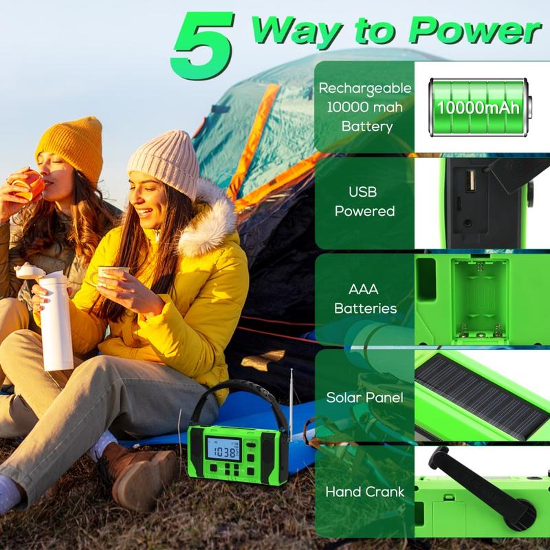 Dzięki czterem wszechstronnym metodom ładowania nigdy nie pozostaniesz bez zasilania: Panel słoneczny (0,1 W), ręczny generator korbowy, wejście Type-C, podtrzymanie bateryjne AAA (baterie AAA nie są dołączone). Zapewnia to zasilanie radiotelefonu podczas nagłych wypadków, wycieczek kempingowych, burz i odległych przygód.