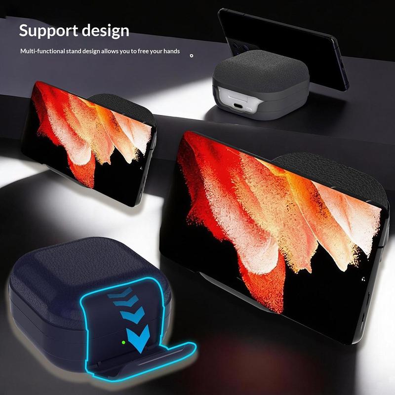 Zintegrowany metalowy karabińczyk ułatwia przymocowanie etui do plecaka, szlufki paska lub breloczka do kluczy, dzięki czemu słuchawki douszne są zawsze pod ręką. Dla dodatkowej praktyczności etui zawiera wbudowany składany uchwyt, który może służyć jako mała podstawka pod telefon do oglądania filmów lub prowadzenia rozmów bez użycia rąk. W zestawie znajduje się również wielofunkcyjny pisak do czyszczenia, który pomaga utrzymać słuchawki douszne, styki ładujące i małe szczeliny w czystości.