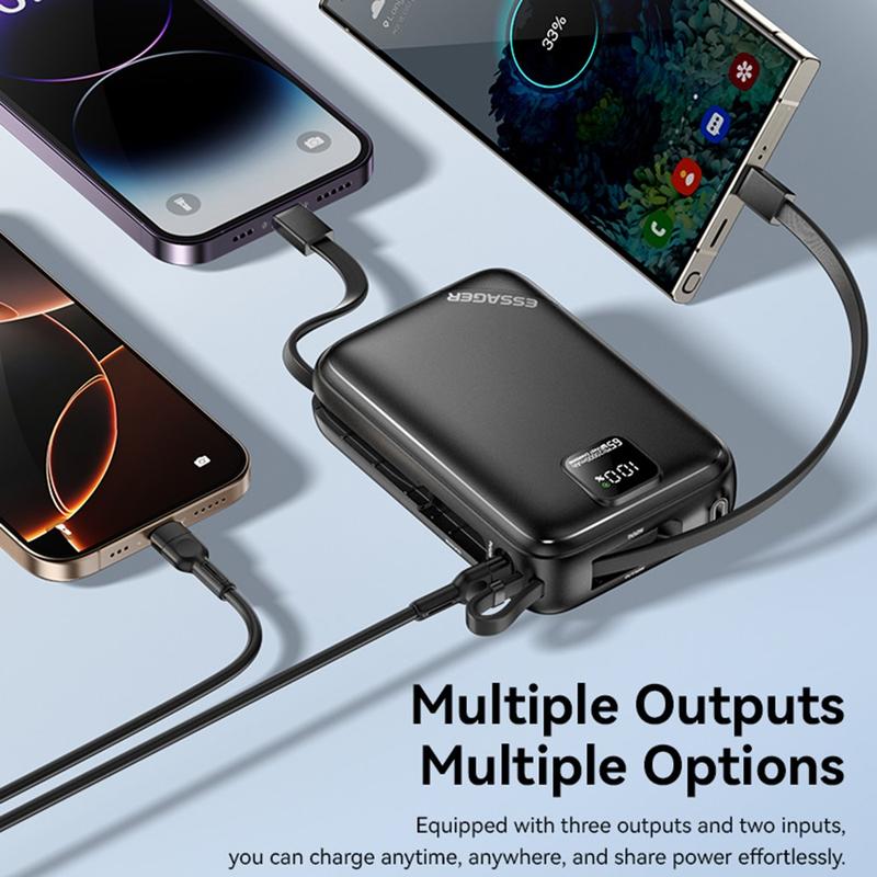 Power bank ESSAGER PD 65W łączy w sobie szybkie ładowanie na poziomie laptopa, dwa wbudowane kable, dużą pojemność i inteligentne monitorowanie LED, dzięki czemu jest to najlepsze rozwiązanie do ładowania w podróży, pracy i codziennego noszenia.