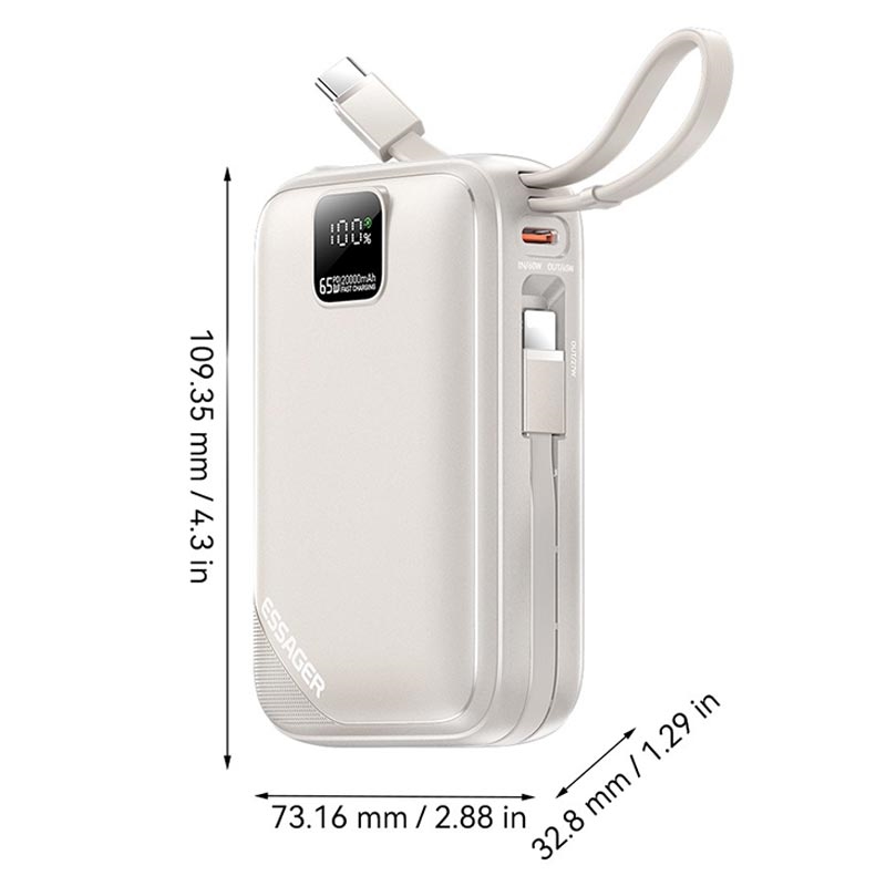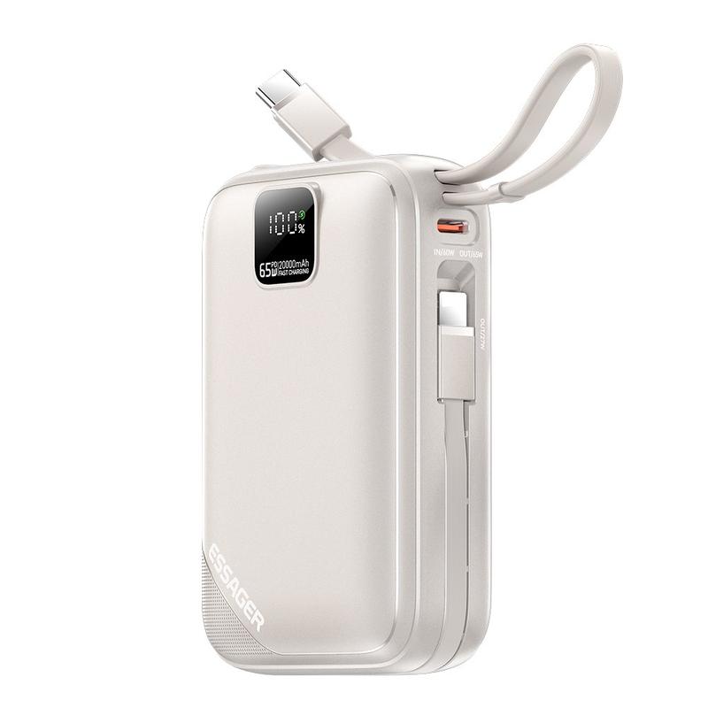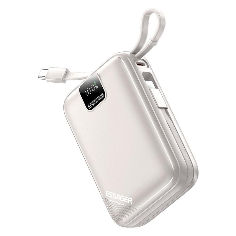 Power bank ESSAGER PD 65W łączy w sobie szybkie ładowanie na poziomie laptopa, dwa wbudowane kable, dużą pojemność i inteligentne monitorowanie LED, dzięki czemu jest to najlepsze rozwiązanie do ładowania w podróży, pracy i codziennego noszenia.