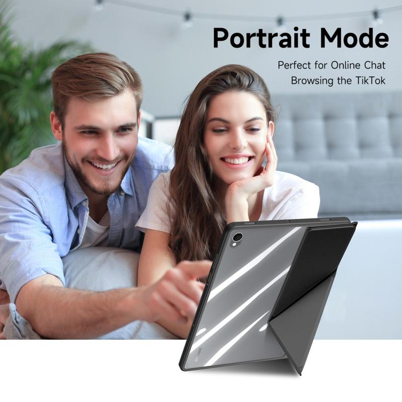Ultra-Slim: Smukła, lekka i miękka w dotyku przednia obudowa wykonana jest z wysokiej jakości skóry PU, odporne na zarysowania wnętrze zapewnia doskonałą ochronę, a ramka TPU + tył z PC sprawiają, że tablet jest bardziej stabilny.