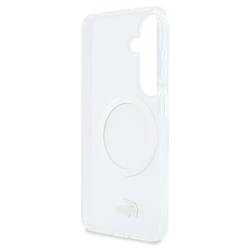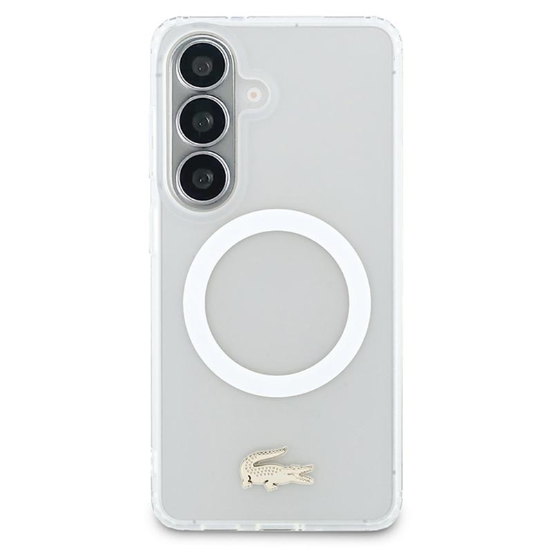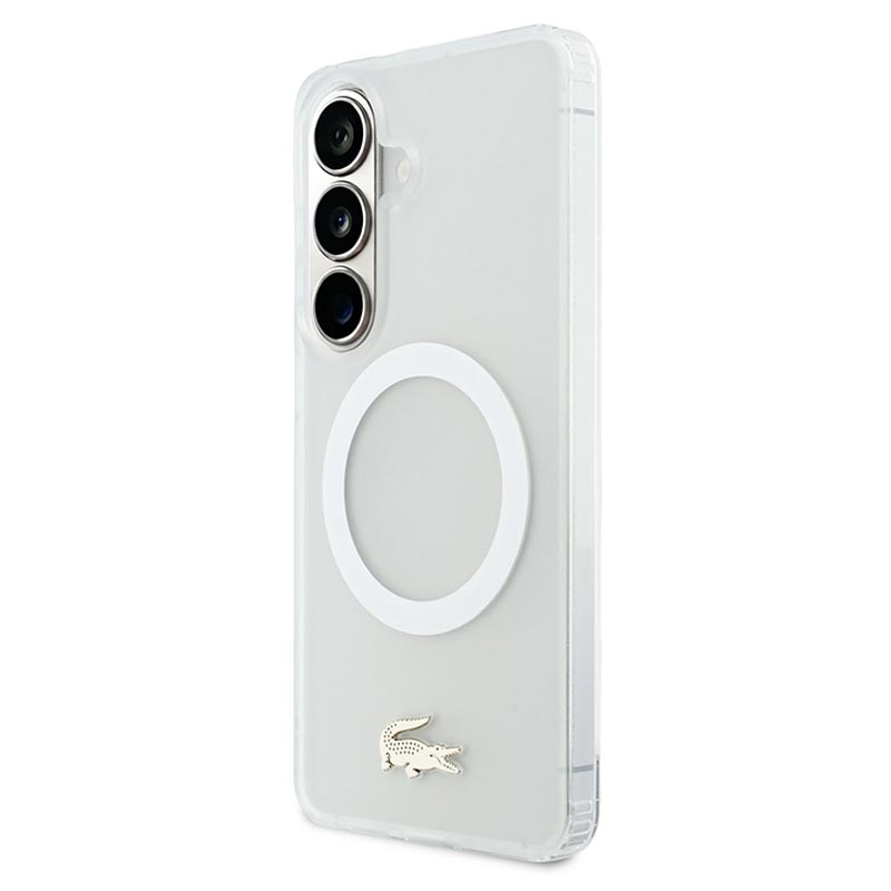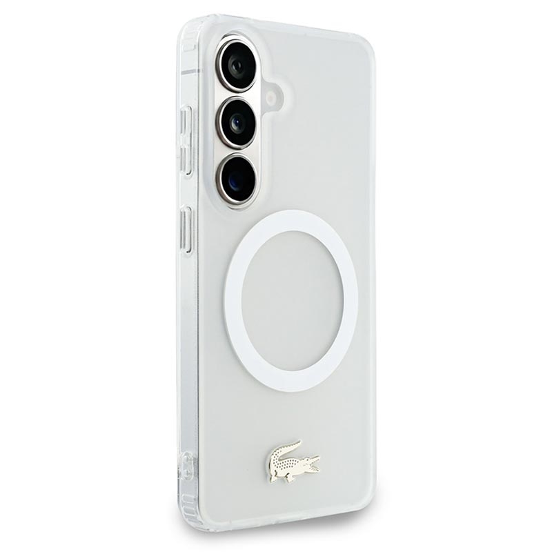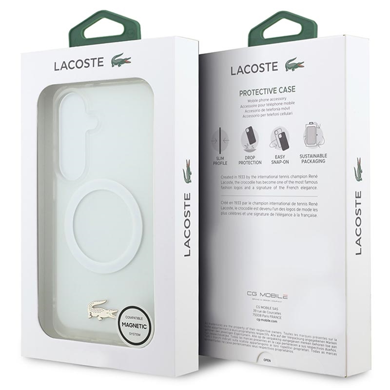 Etui Lacoste Frosted Finish Gold Logo MagSafe to stylowa ochrona Samsung Galaxy S26. Wykonane z wytrzymałej mieszanki poliwęglanu (PC) i elastycznego TPU, etui zapewnia niezawodną ochronę na co dzień, zachowując jednocześnie elegancki, smukły profil. Matowe, matowe wykończenie podkreśla kultowe złote logo krokodyla i elegancką złotą ramkę aparatu, dodając urządzeniu luksusowego charakteru. Dzięki kompatybilności z MagSafe obsługuje bezprzewodowe ładowanie i akcesoria bez kompromisów.