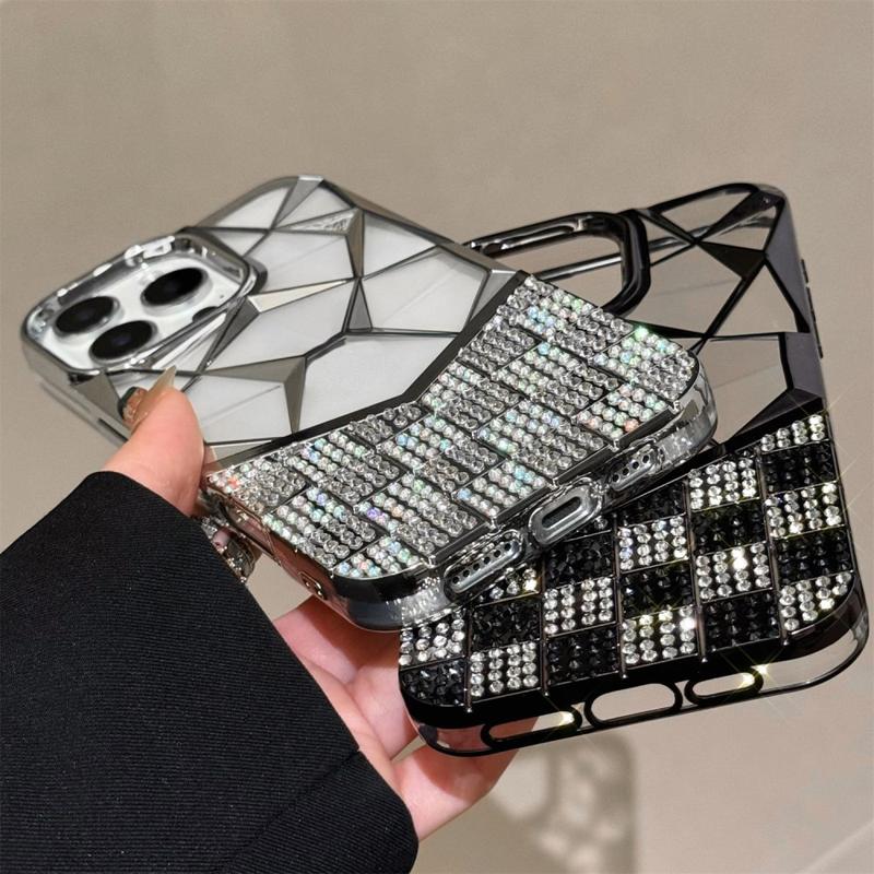 Geometryczne etui z diamentowym wzorem na iPhone 16 Pro Max - galwanizowana osłona z TPU z ozdobnymi kryształkami i ochroną przed wstrząsami