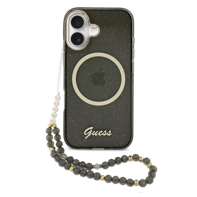 Etui na pasek MagSafe Guess IML Glitter Script do iPhone 17 - brokatowa tylna obudowa z paskiem na nadgarstek, ochrona PC+TPU, kompatybilność z MagSafe
