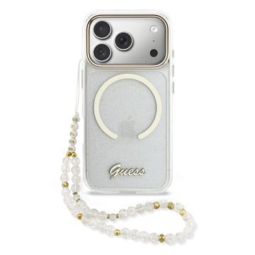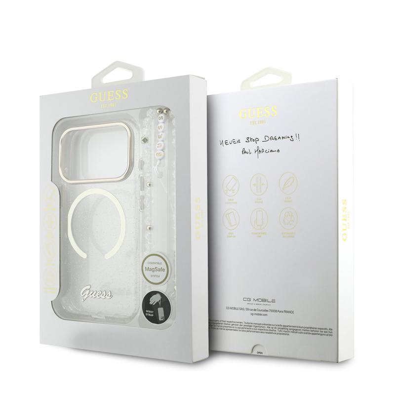 Etui na pasek MagSafe Guess IML Glitter Script do iPhone 17 Pro Max - brokatowa tylna obudowa z paskiem na nadgarstek, ochrona PC+TPU, kompatybilność z MagSafe