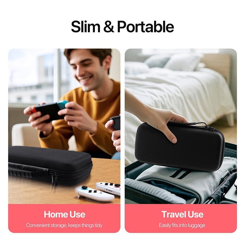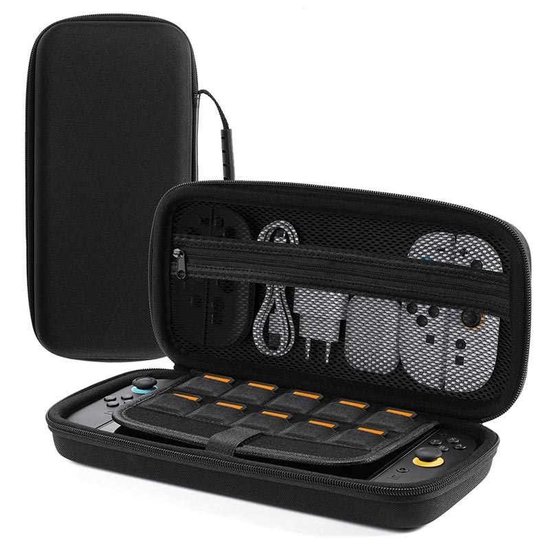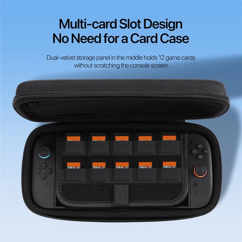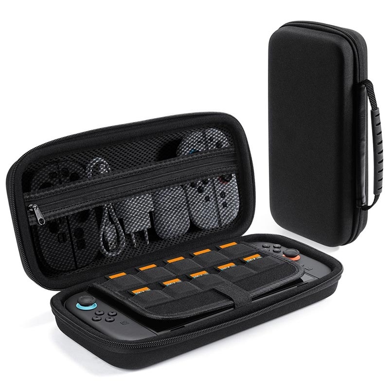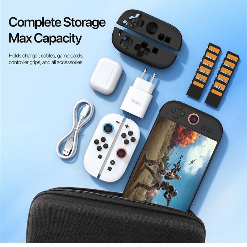 - Dużo miejsca wewnątrz na ładowarki, kable do transmisji danych i uchwyty Joy-Con, dzięki czemu wszystko jest uporządkowane w jednym miejscu