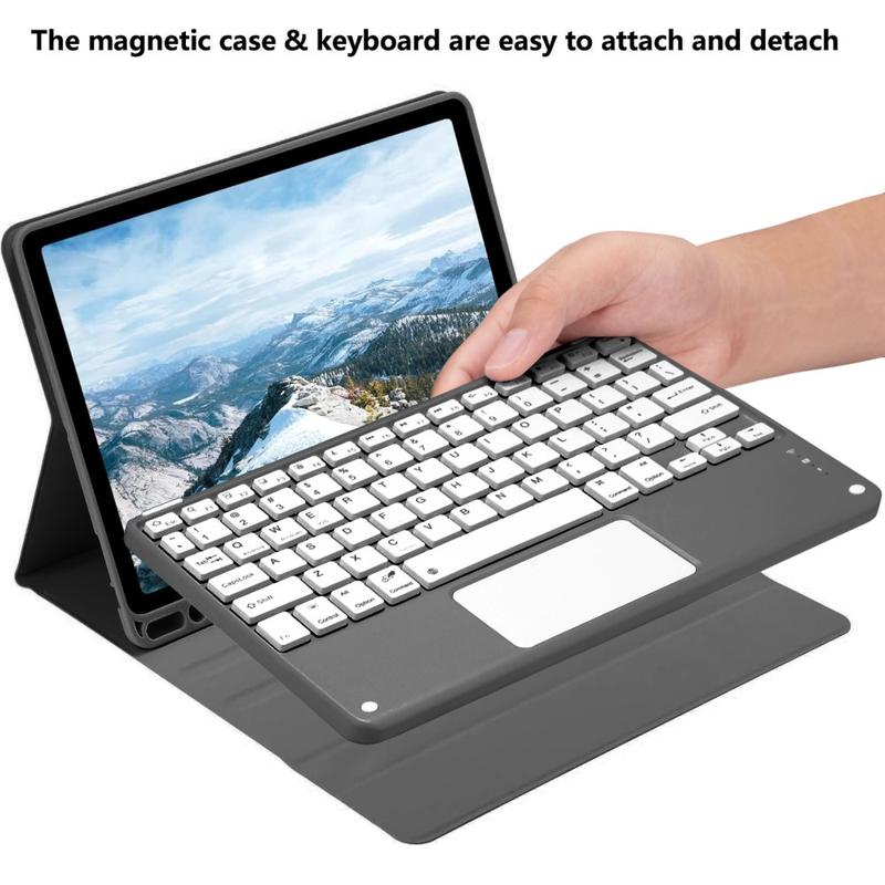 Wzbogać swój iPad Air 11 2026/2025/2024, iPad Air 2022/2020 o etui z klawiaturą Bluetooth, wielofunkcyjne akcesorium 2 w 1, które łączy w sobie ochronę, produktywność i styl. Wykonane z wysokiej jakości poliuretanu, to eleganckie etui zapewnia pełną ochronę przed zadrapaniami, wstrząsami i odciskami palców, zachowując jednocześnie profesjonalny wygląd. Klawiatura Bluetooth łączy się bezprzewodowo, zapewniając płynne i responsywne pisanie, a zintegrowany touchpad obsługuje sterowanie wieloma gestami, zapewniając łatwą nawigację. Podświetlana klawiatura umożliwia wygodne pisanie nawet przy słabym oświetleniu. Wbudowana regulowana podstawka zapewnia ergonomiczny kąt widzenia, dzięki czemu idealnie nadaje się do pisania, przesyłania strumieniowego lub czytania. Zaprojektowane z myślą o biznesie, podróży lub codziennym użytkowaniu, to etui z klawiaturą przekształca tablet w przenośną stację roboczą.