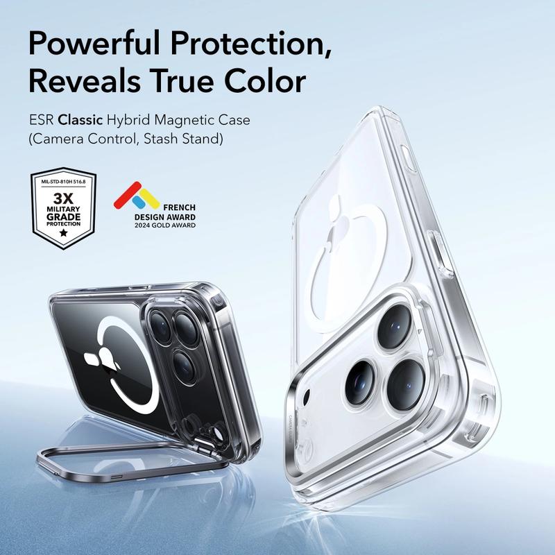 Etui ESR Classic Hybrid Kickstand Case do iPhone 17 Pro łączy w sobie smukłą elegancję z potężną ochroną. Jego przezroczysty, twardy tył prezentuje oryginalny design iPhone 17 Pro, a wzmocnione rogi TPU zapewniają dodatkową trwałość przed upadkami i uderzeniami.