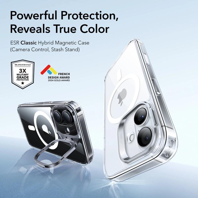 ESR Classic Hybrid Kickstand Case dla iPhone 17 łączy w sobie smukłą elegancję z potężną ochroną. Jego przezroczysty, twardy tył prezentuje oryginalny design iPhone 17, a wzmocnione rogi TPU zapewniają dodatkową trwałość przed upadkami i uderzeniami.