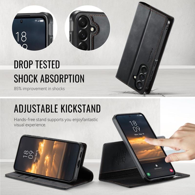 CaseMe C49 Wallet Case do Samsung Galaxy A57 jest wykonany z wytrzymałego TPU i poliuretanu, oferując wygodny chwyt i niezawodną ochronę przed codziennymi wstrząsami, upadkami i zadrapaniami. Wewnątrz znajduje się miękka podszewka z mikrofibry, która zapewnia nieskazitelny wygląd urządzenia.