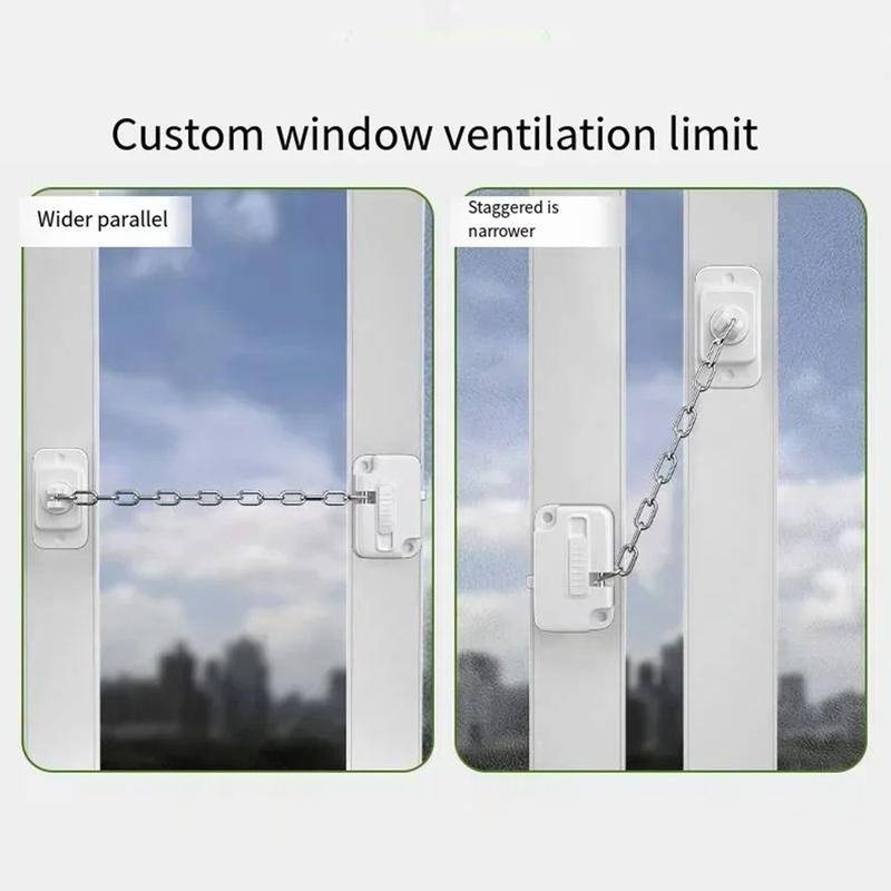 Regulowana długość łańcucha pozwala zdecydować, jak daleko okno lub drzwi mogą się otworzyć. Funkcja ta zapewnia prawidłowy przepływ powietrza przy jednoczesnym zachowaniu bezpieczeństwa dzieci i zwierząt domowych, co czyni ją doskonałym akcesorium bezpieczeństwa dla domów i mieszkań.